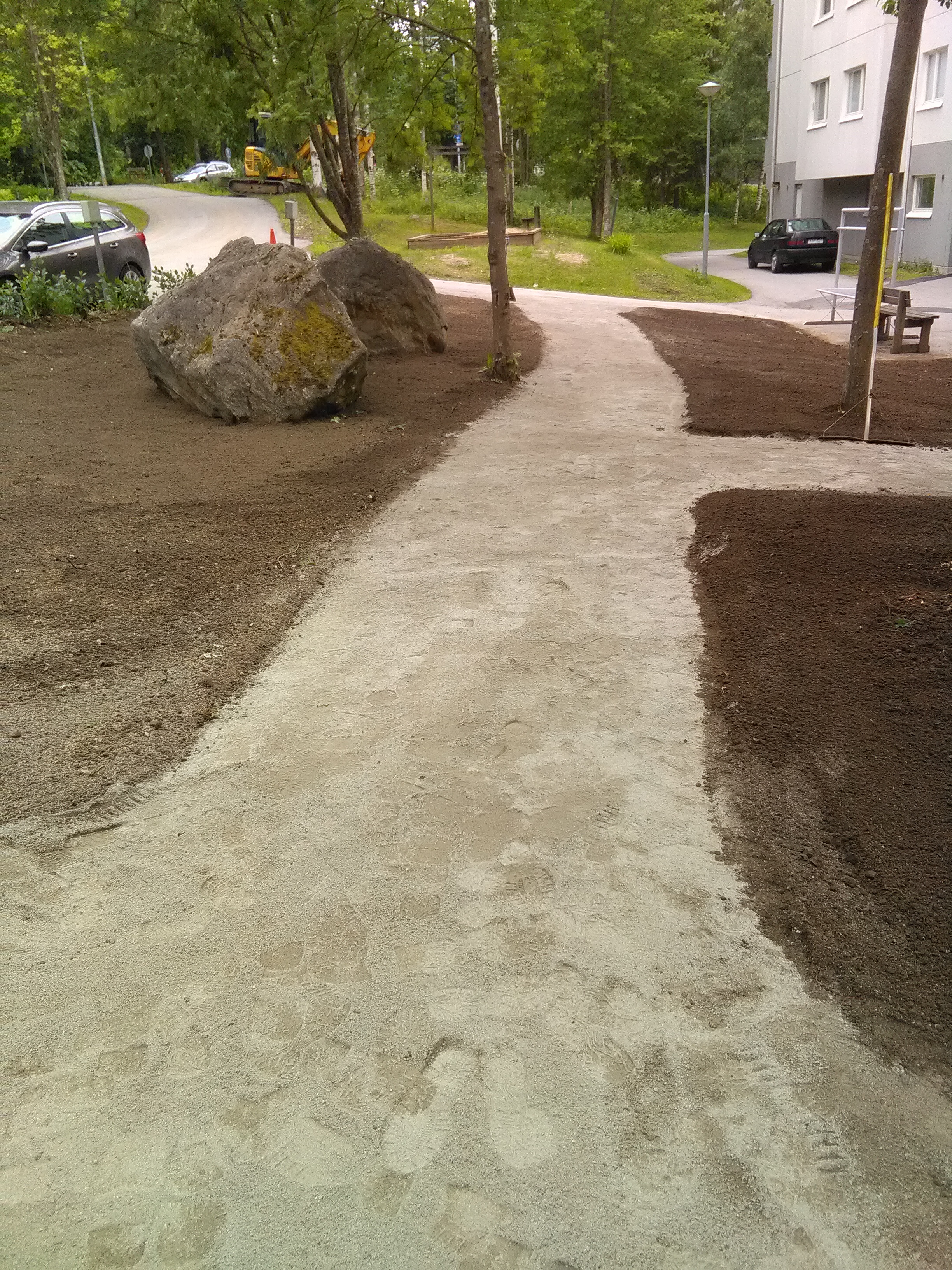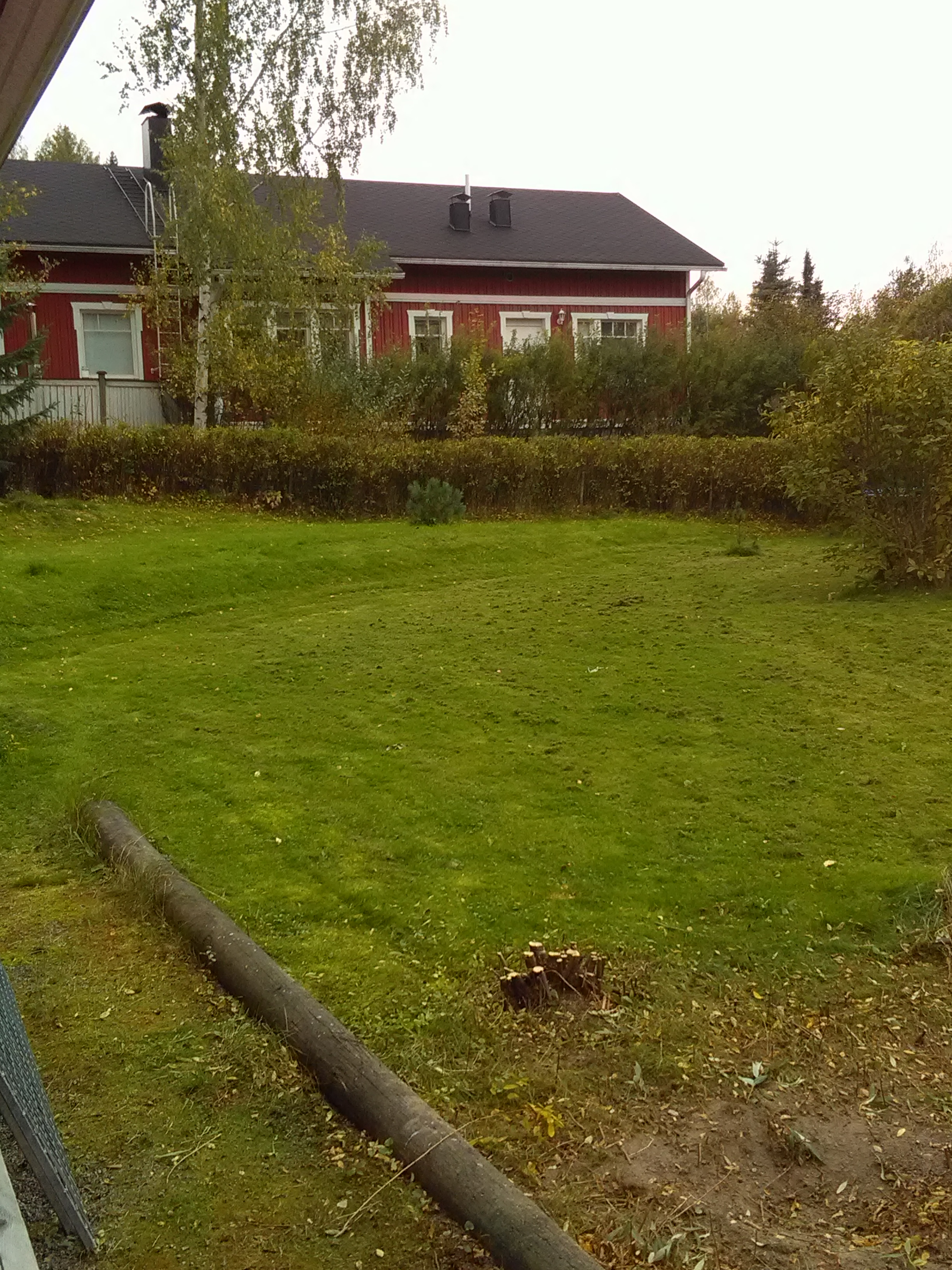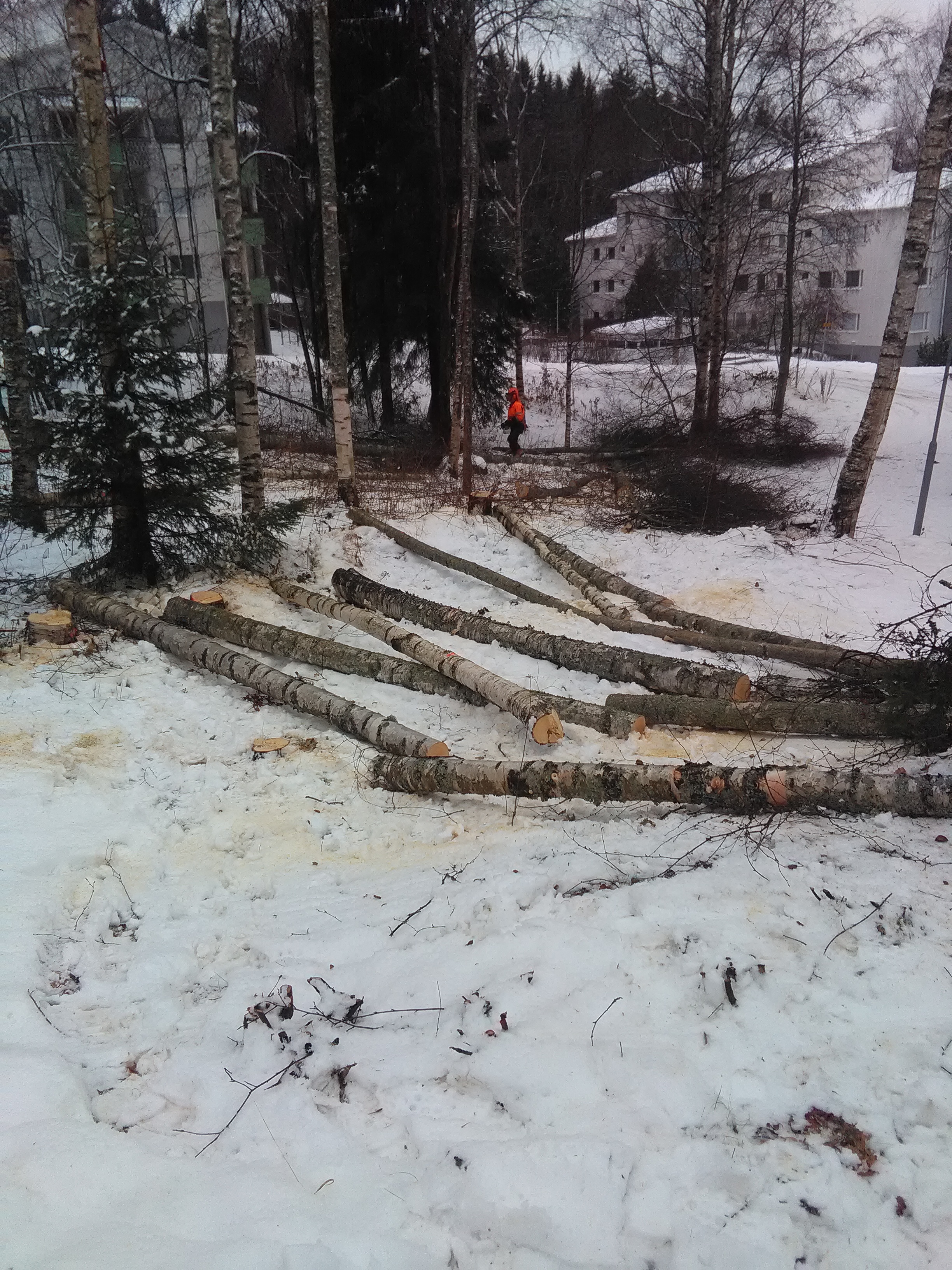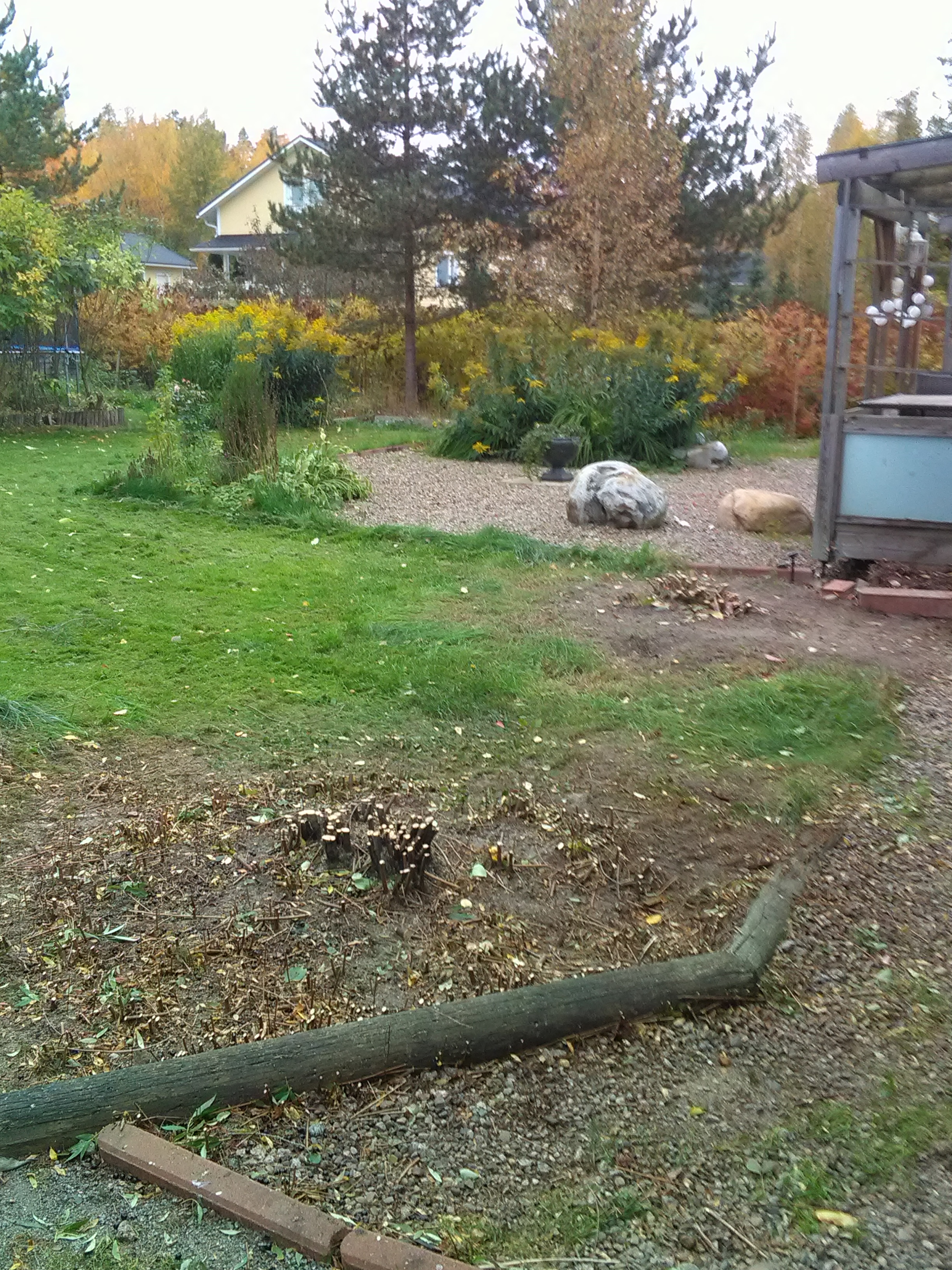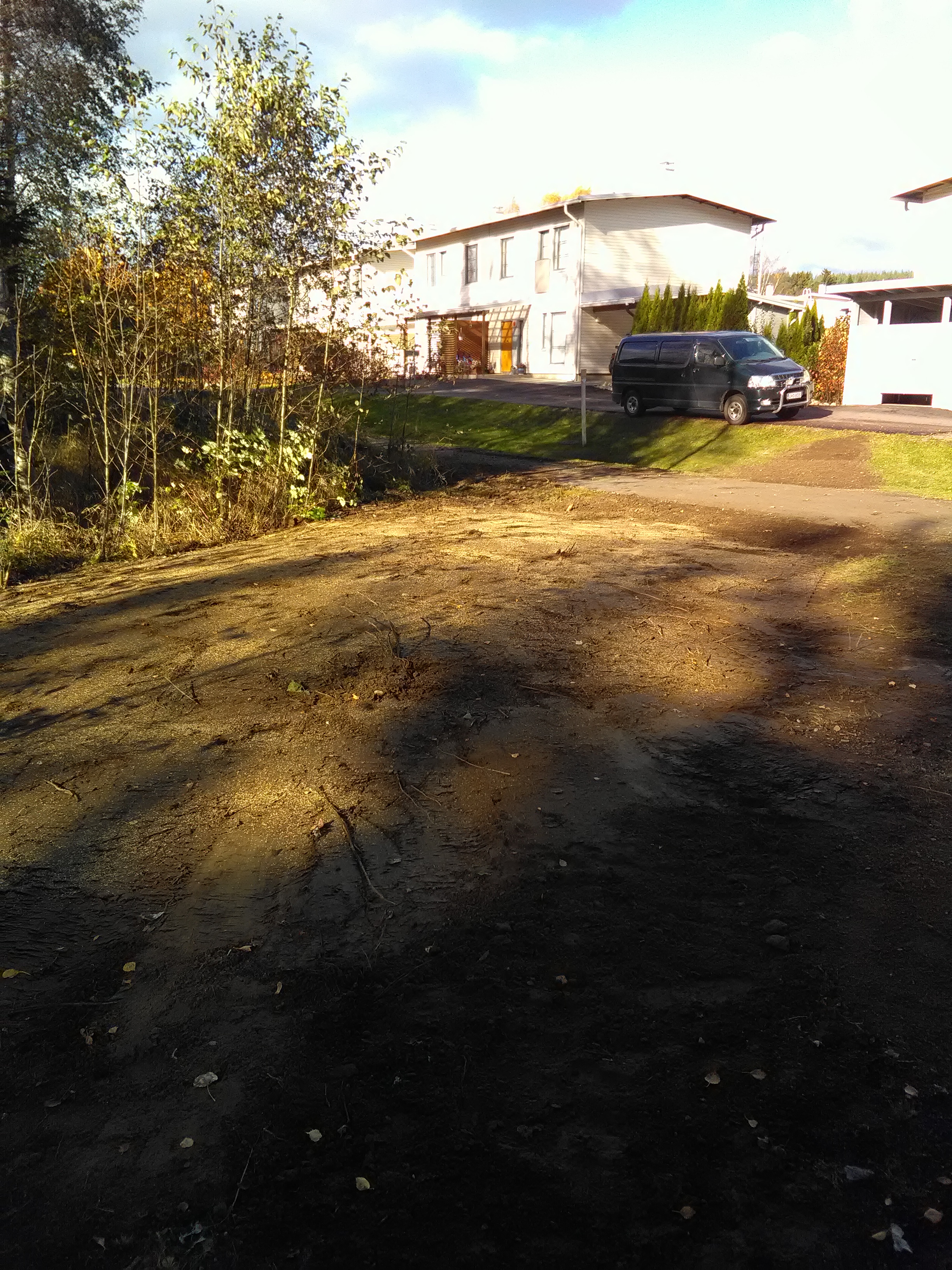 Kuvia tehdystä puutarha, maanrakennustöistä ja pihapuiden kaatamisesta.