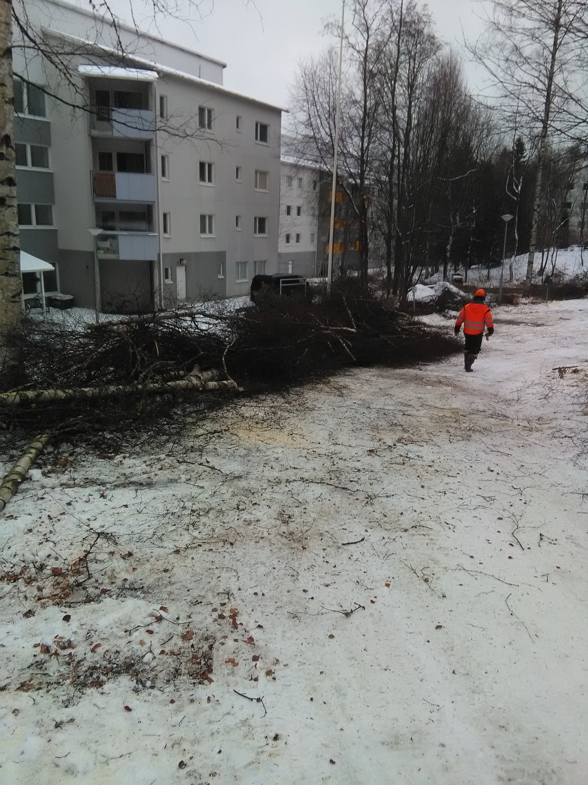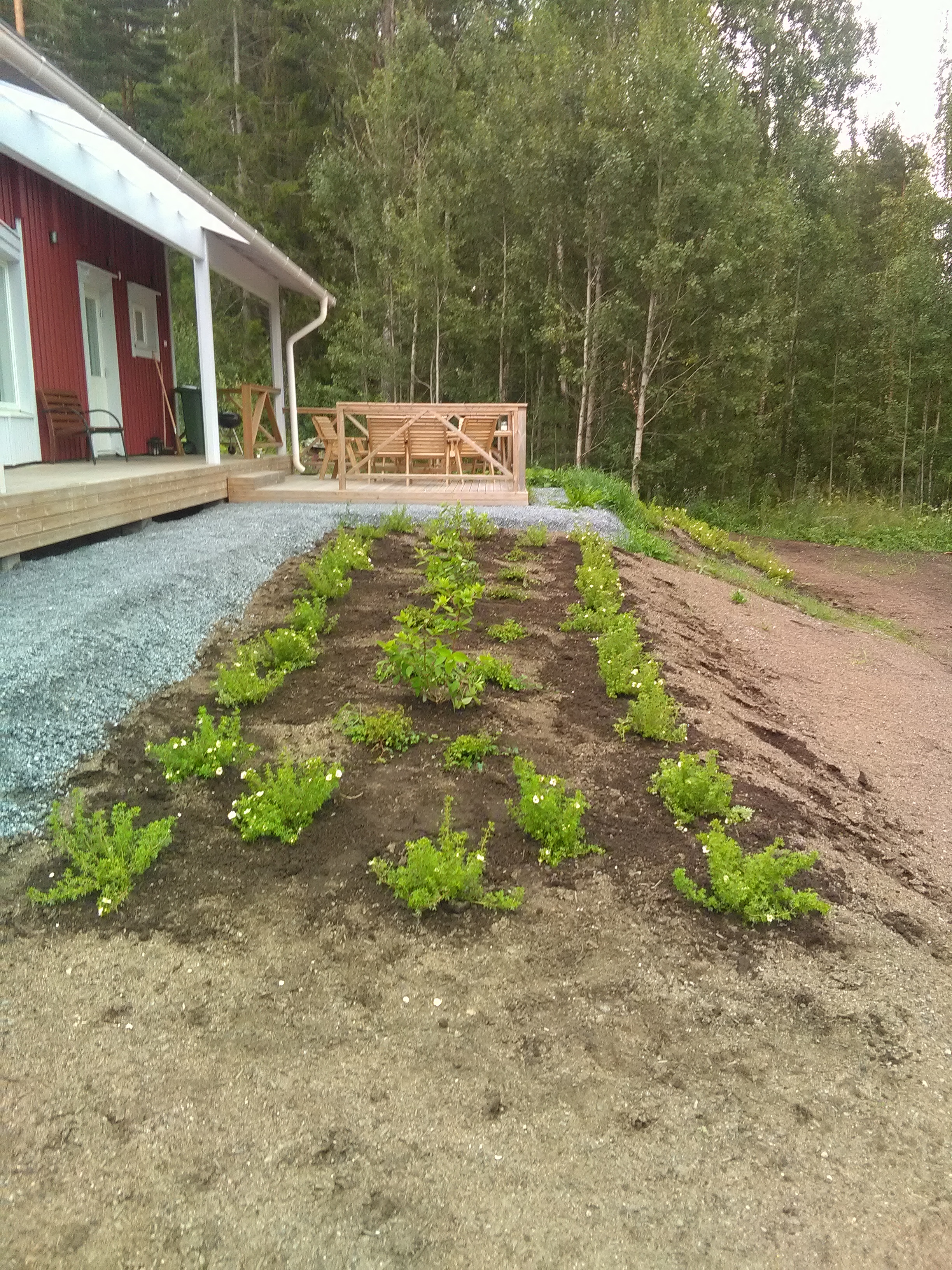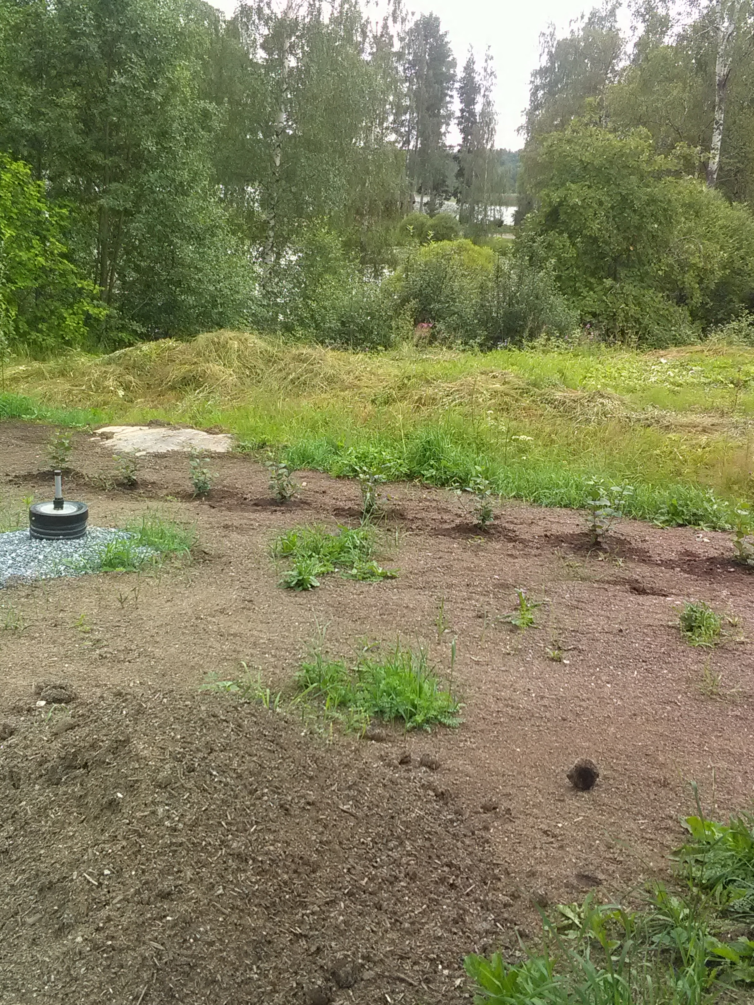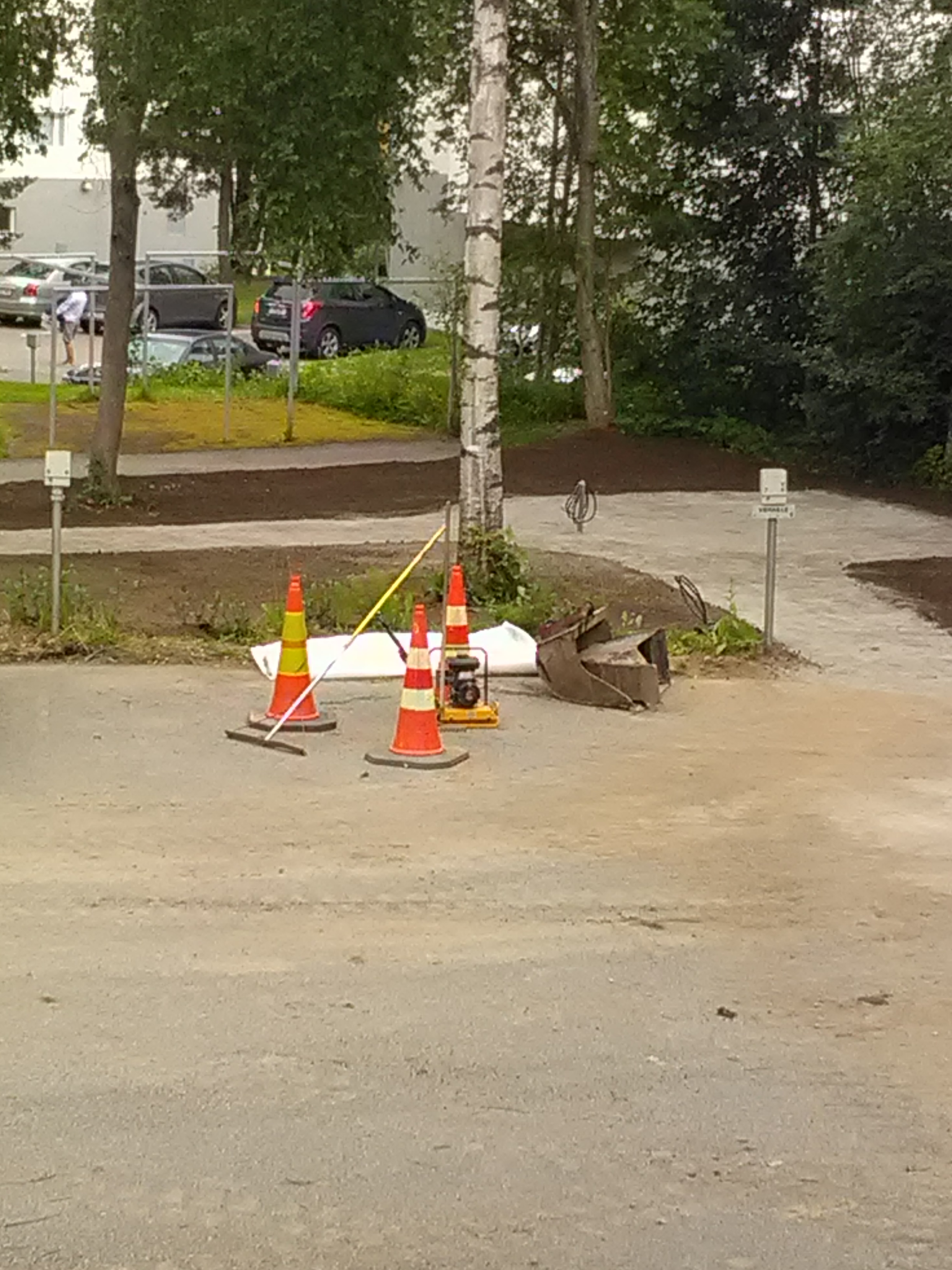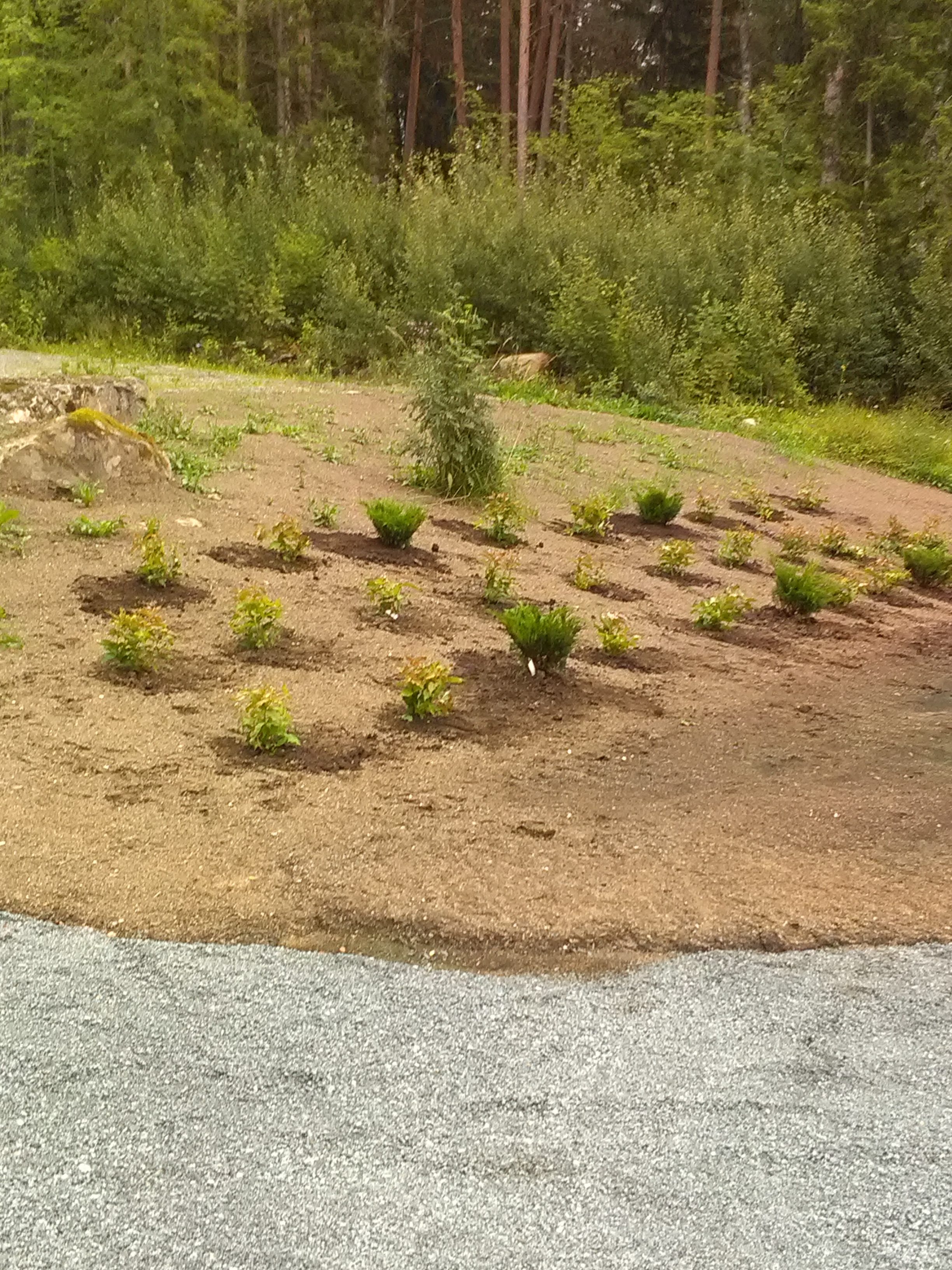 Kuvia tehdystä puutarha, maanrakennustöistä ja pihapuiden kaatamisesta.